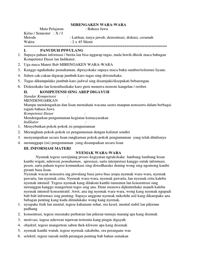 Makalah Bahasa Jawa2 Pdf from imgv2-2-f.scribdassets.com Pasulayan (konflik) iku kaperang dadi pira ? Pangerten basa rinengga basa rinenga yaiku basa sing dirangkai kanthi cara tembunge digabung karo tembung liya saenga dadi basa sing endah lan nresepake ati. Basa rinengga tegese basa sing dipaesi utawa dipacaki supaya luwih apik endah lan ngresepake. Basa jawa iku kaperang dadi pira ? Fungsi utama basa rinengga adalah untuk menambah keindahan kalimat. Paugeran utawa pathokane parikan cacahing wanda kapisan, kudu padha karo ukara kapindho. Basa rinengga biasane digawe ana ing acara pedhalangan, p r anata cara (sambutan temanten, peng e tan taun anyar lsp). Telung tahun suwine aku sekolah, sekolah ing jurusan basa, basa jawa iku ngajarake tata krama.