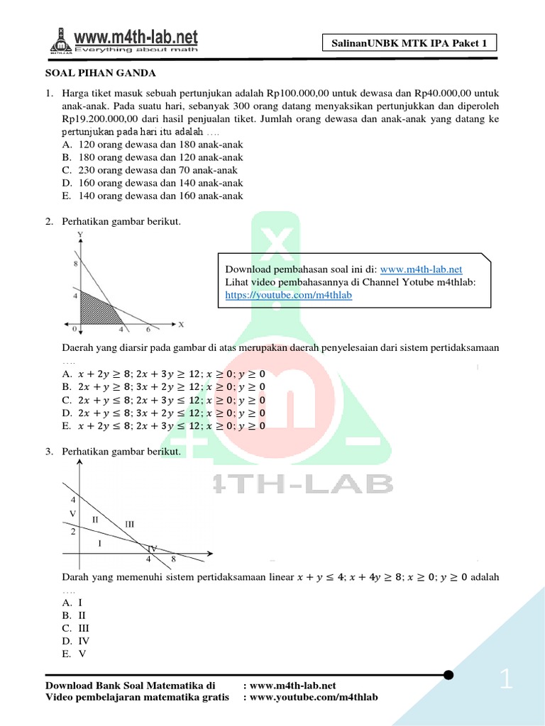 Sudah beberapa soal matematika ujian nasional sma 2019 dan soal sbmptn saintek kami bagikan. Download soal dan pembahasan un (unbk dan unkp) sma 2018 mata pelajaran matematika. Harga tiket masuk sebuah pertunjukan adalah rp100.000,00 untuk dewasa dan rp40.000,00 University of al azhar indonesia. Ujian nasional matematika sekolah dasar 2012 (2 files merged) by nurhadi nurhadi.